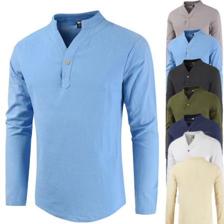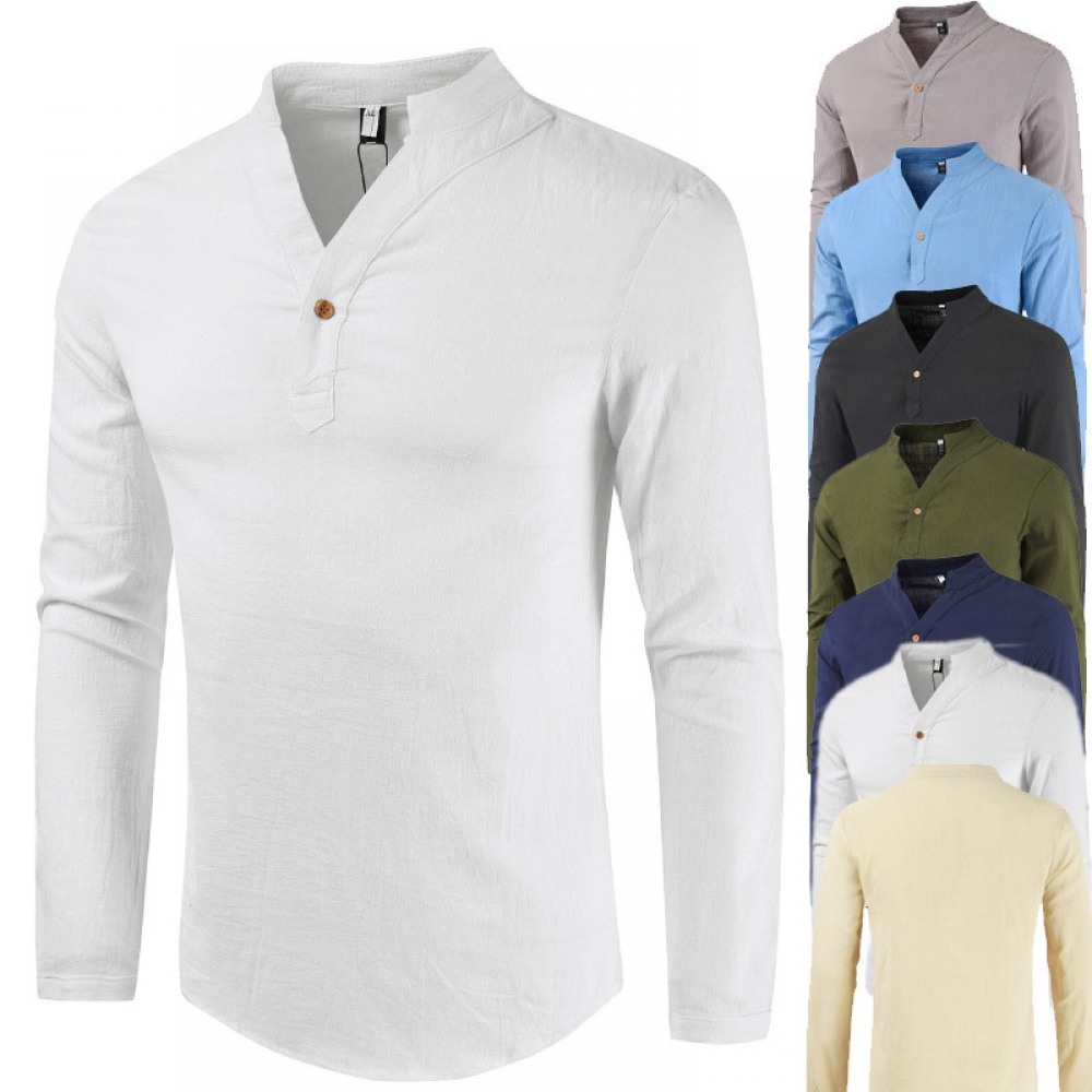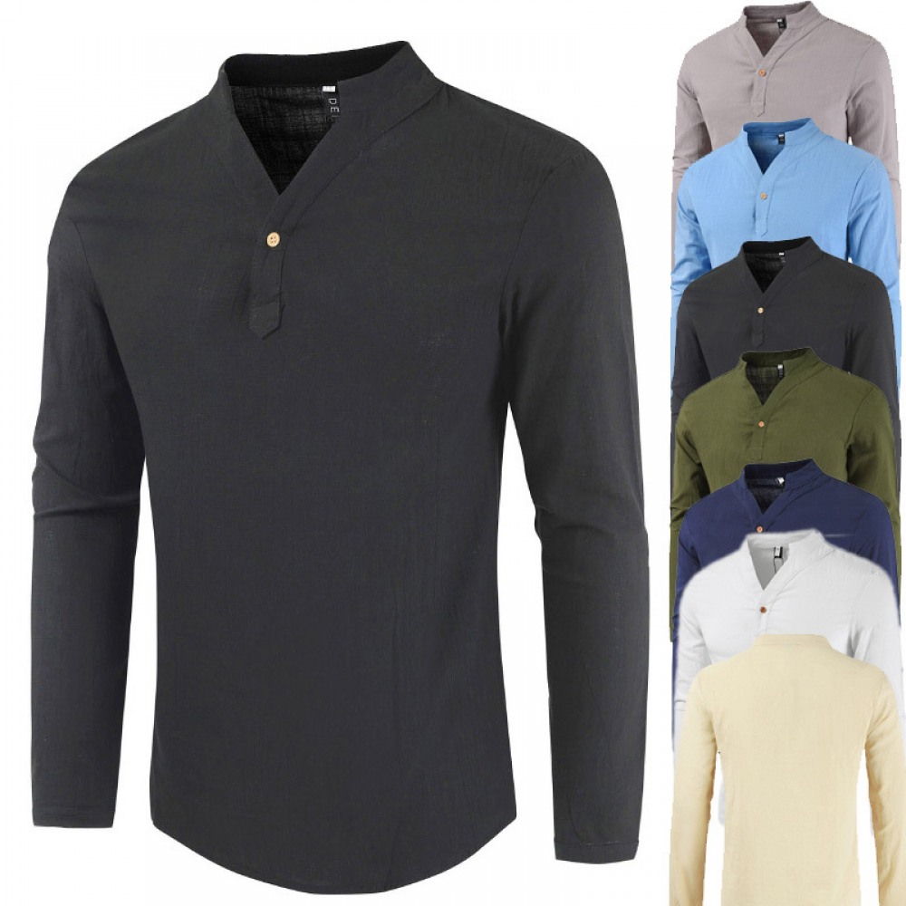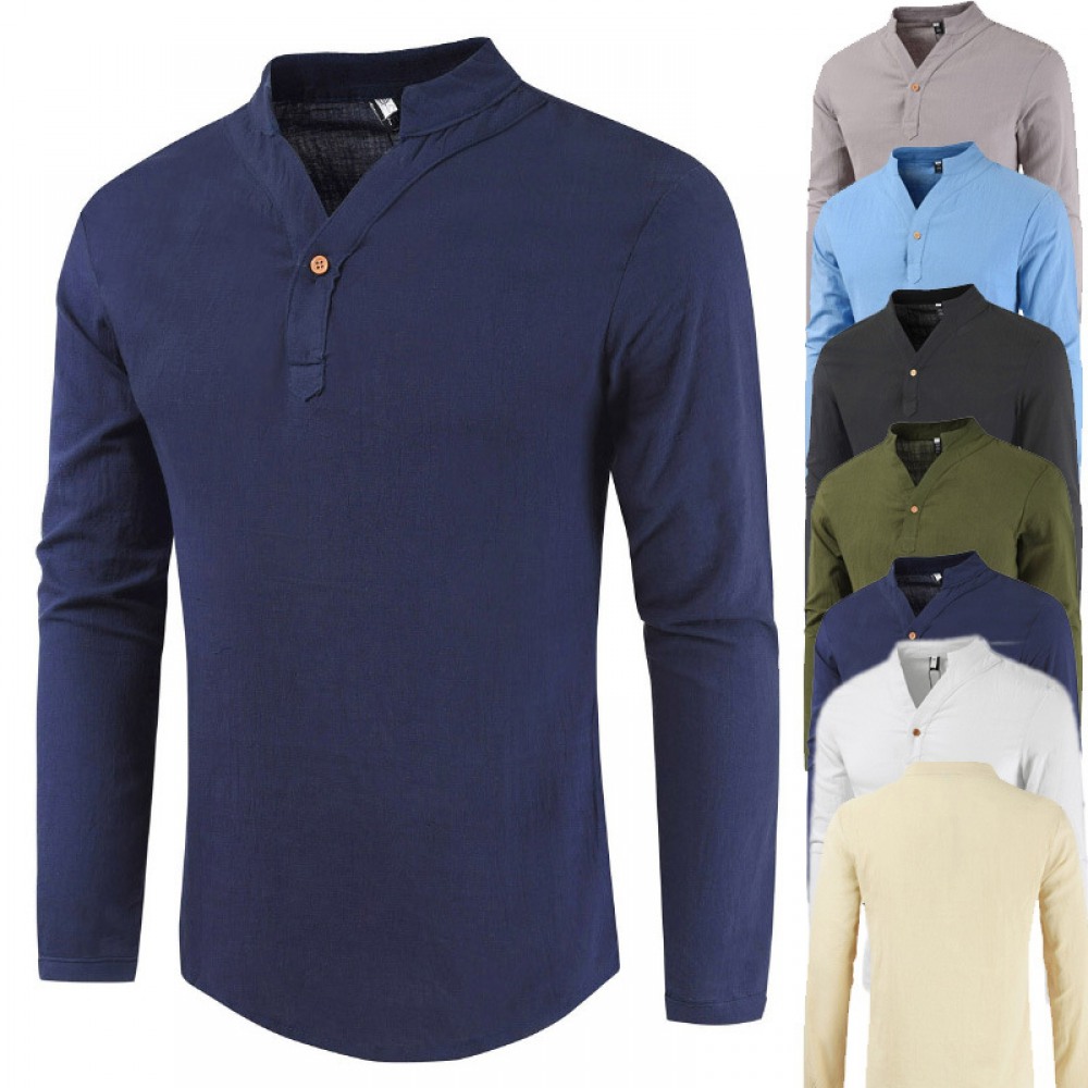 Summer V-Neck Cotton and Linen Long-Sleeved T-Shirt Men's Cotton and Linen Plus Size Bottoming Shirt Stand-Up Collar